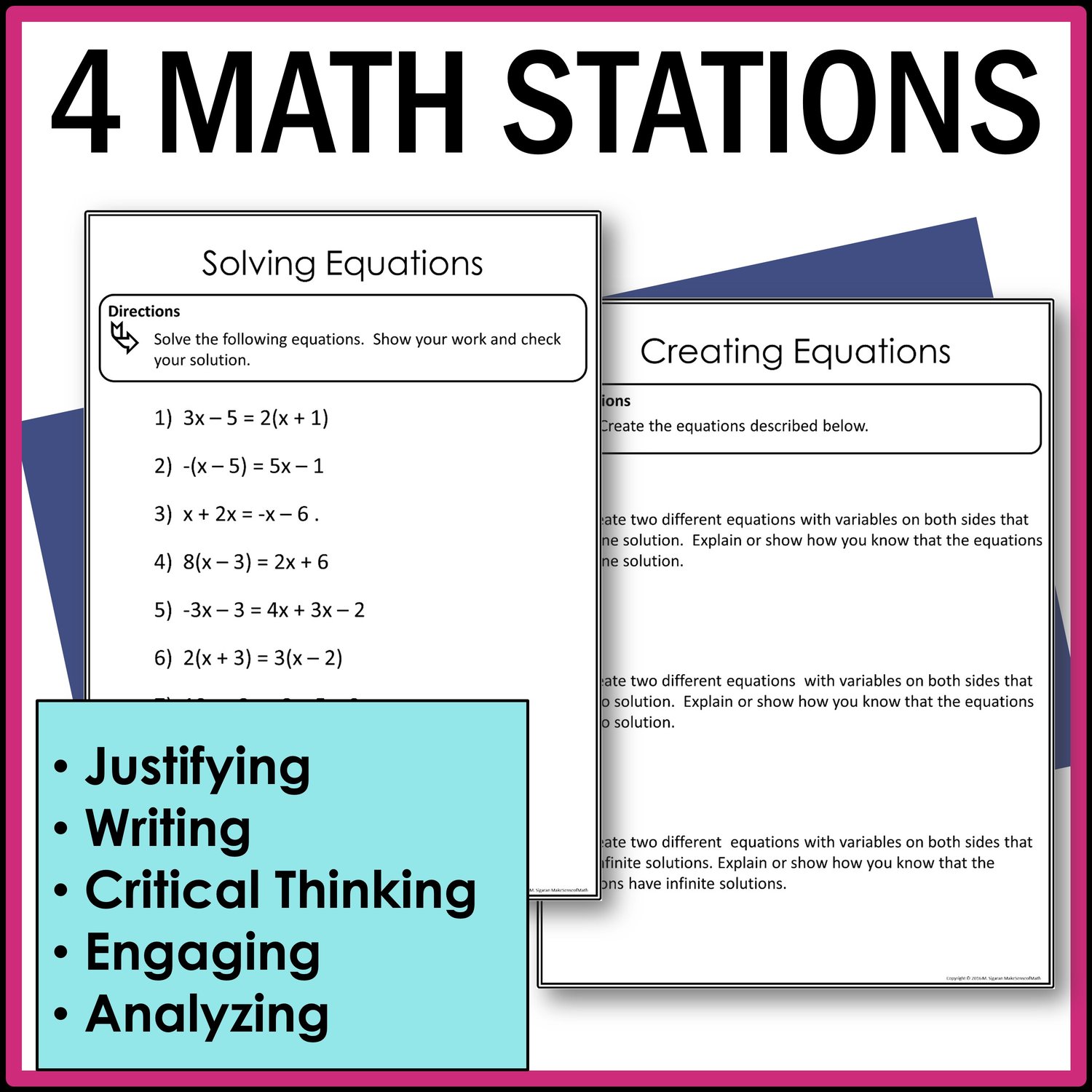 - Creating Equations: Students will create equations with variables on both sides with one, infinite and no solutions. They will justify their reasoning.