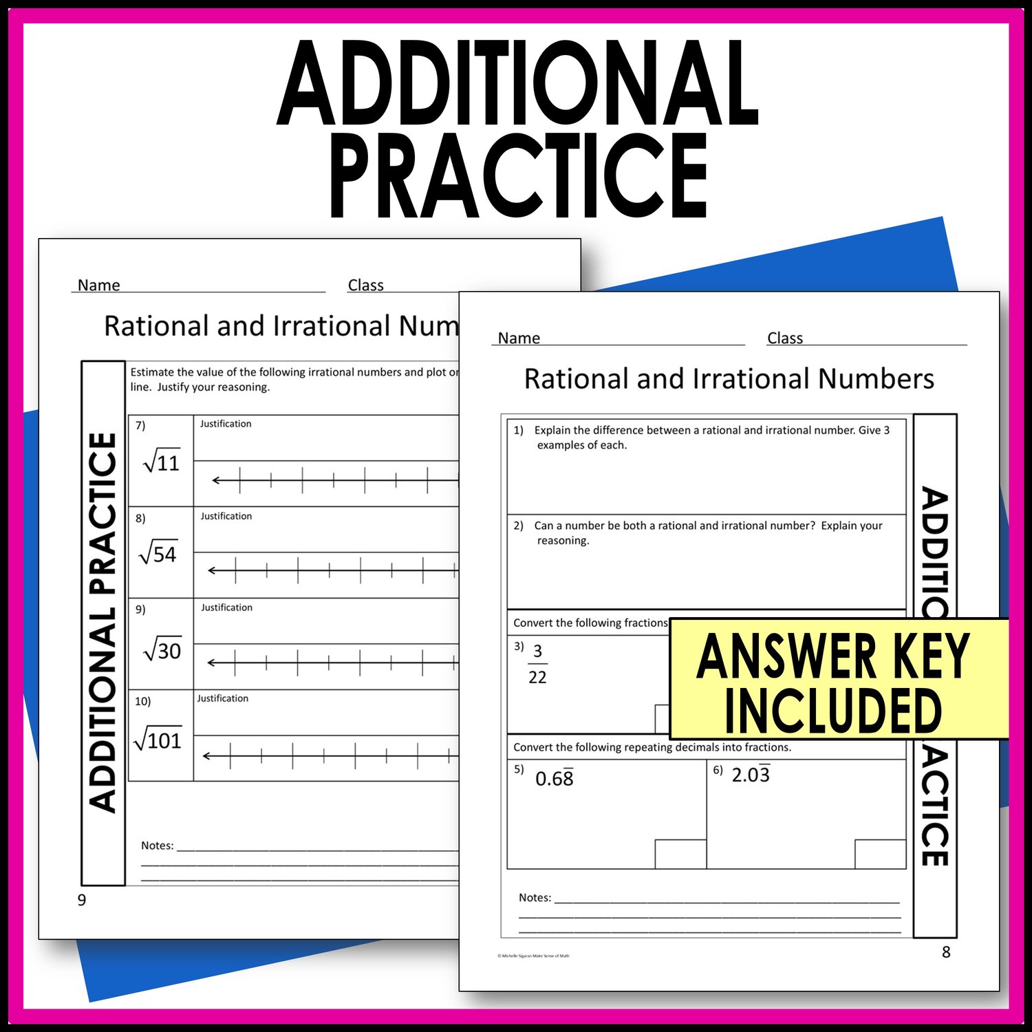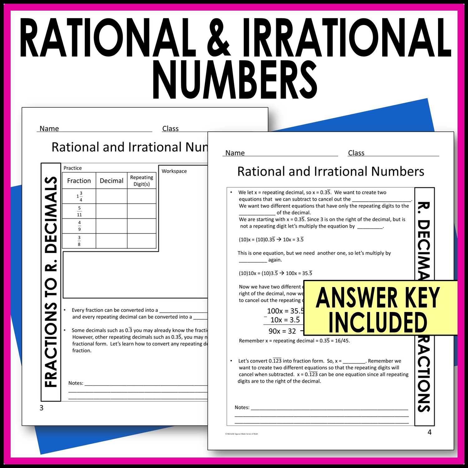 These guided notes on rational and irrational numbers are aligned with 8th grade Common Core State Standards. They focus on understanding rational and irrational numbers, converting fractions to decimals, converting decimals to fractions, and approximating irrational numbers. Students will calculate, explain, analyze, and explore the real number system.