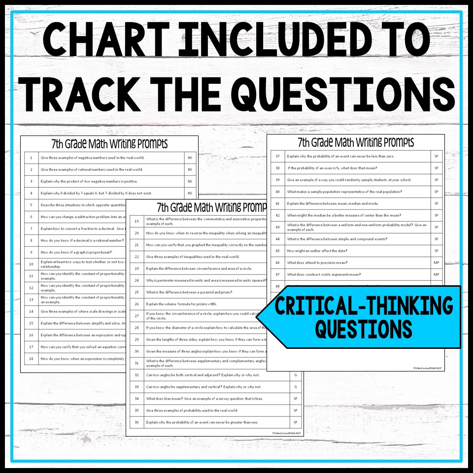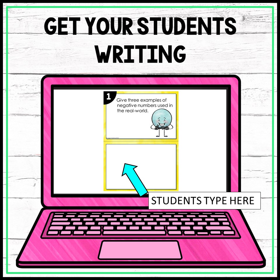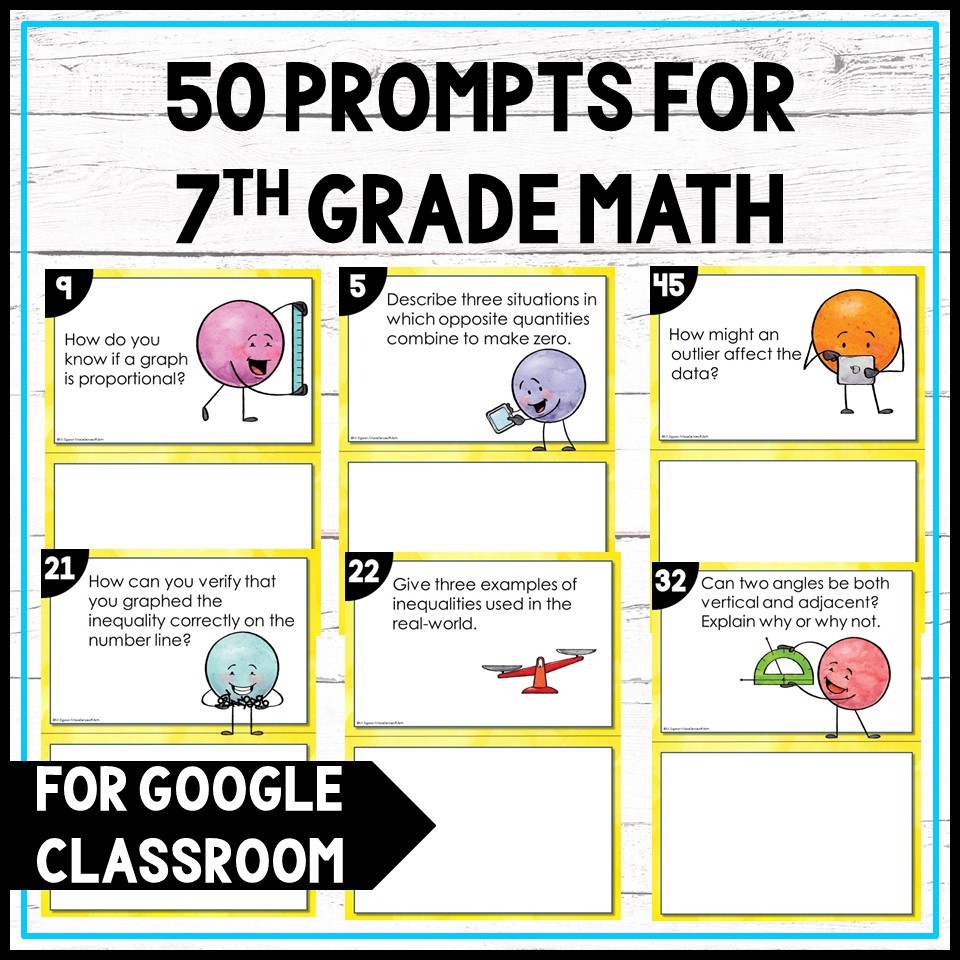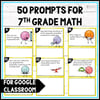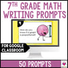 These 50 writing prompts for 7th grade math are designed to help students articulate their understanding of mathematical concepts. This version is optimized for Google Slides, making it ideal for distance learning, where students can type their responses directly onto the slides.