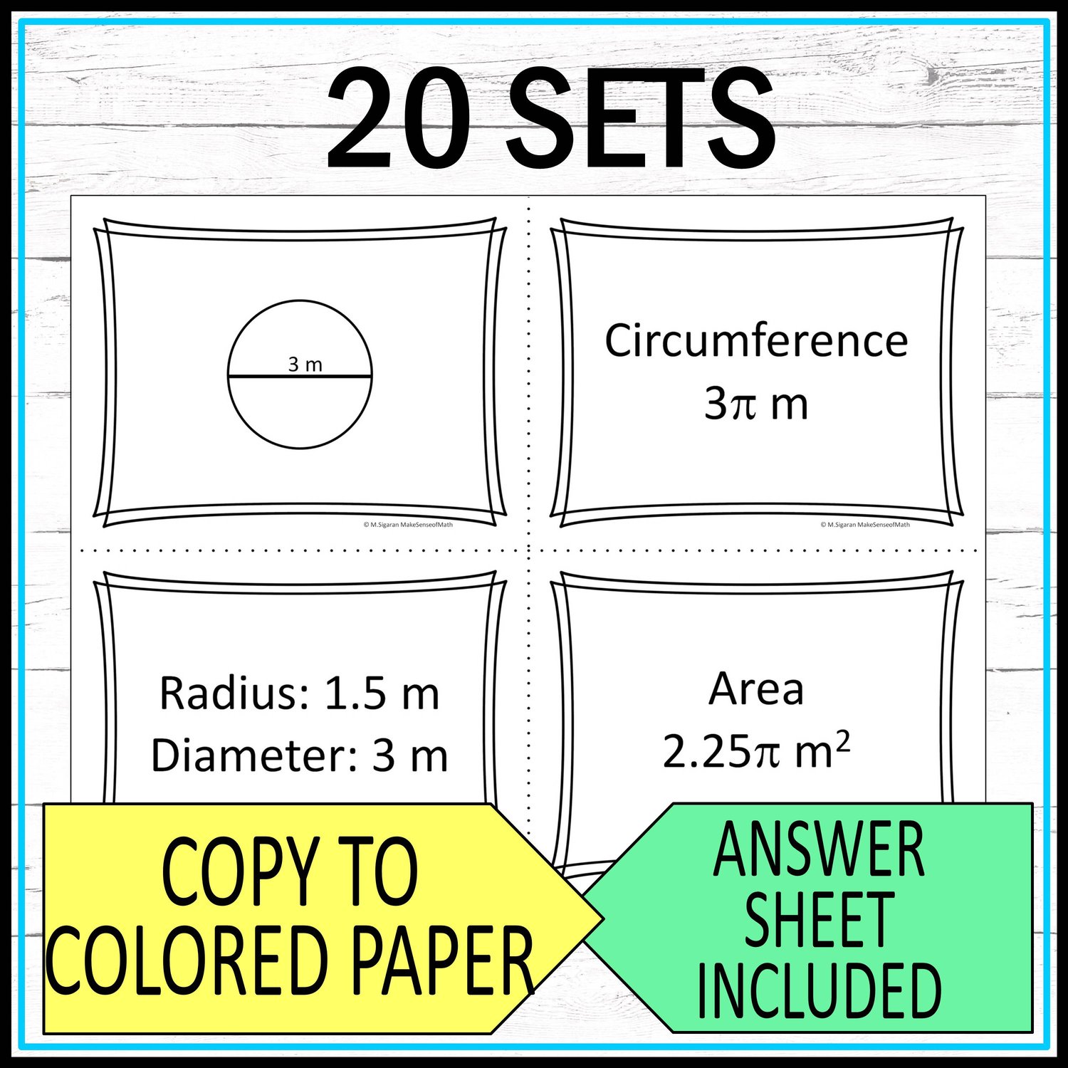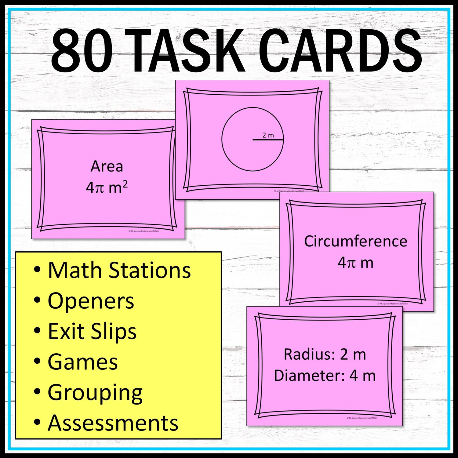 - 80 circle area and circumference task cards. 20 sets of 4: one visual circle marked with radius or diameter, radius and diameter measurements, circumference and area (written in exact form).