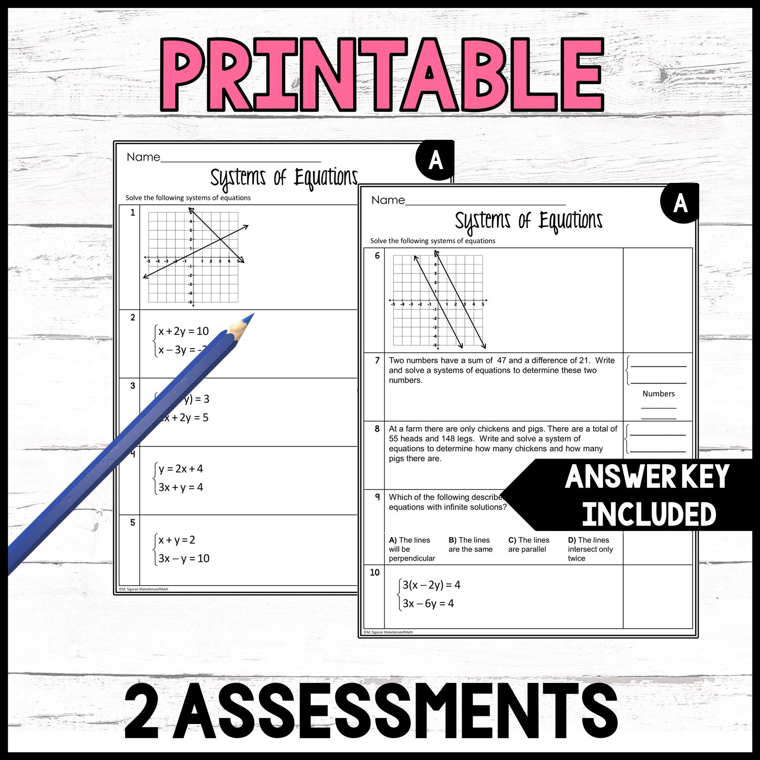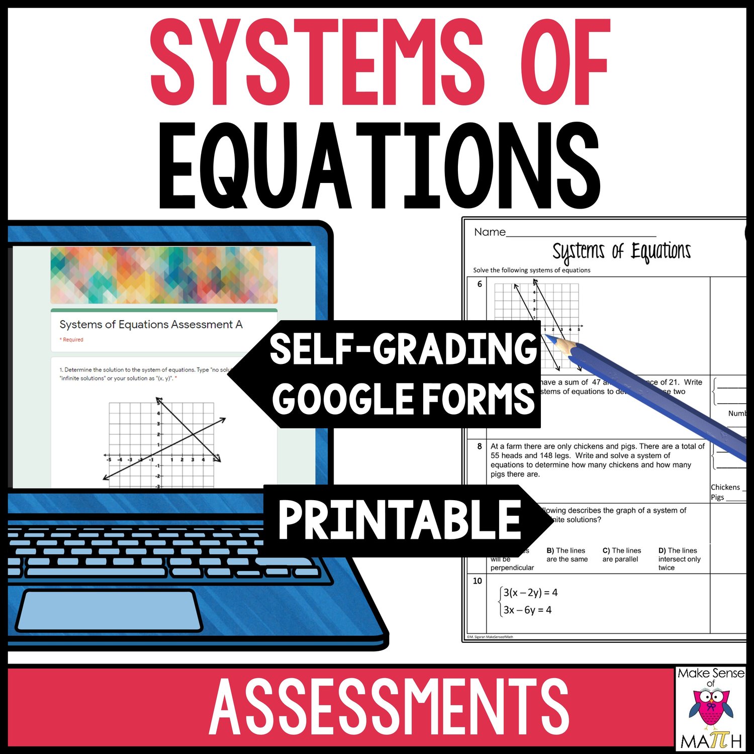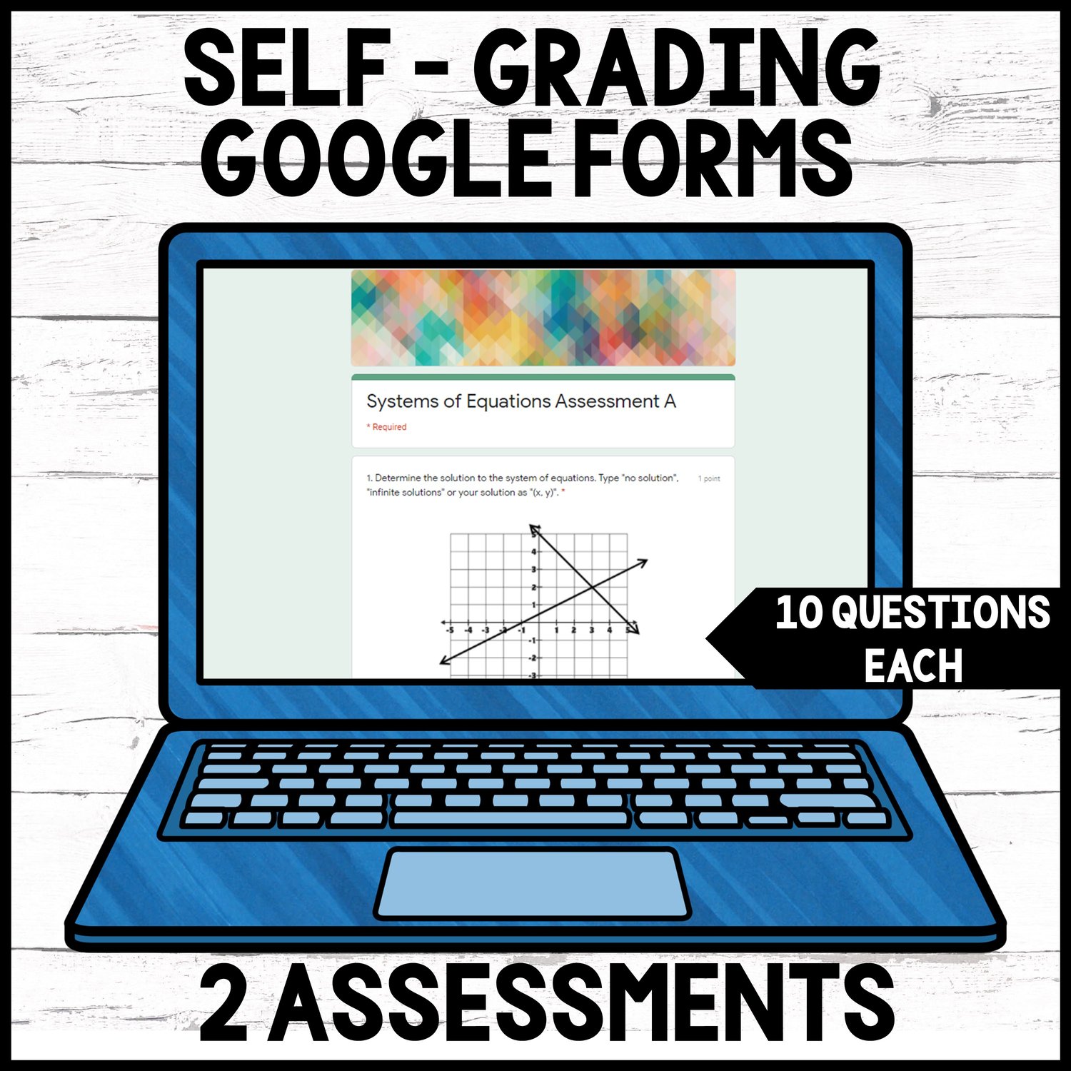 These Google Classroom self-grading assessments for systems of equations cover solving by graphing, algebraic methods, and word problems. They address scenarios with one solution, infinite solutions, or no solution. A printable version is also included!
