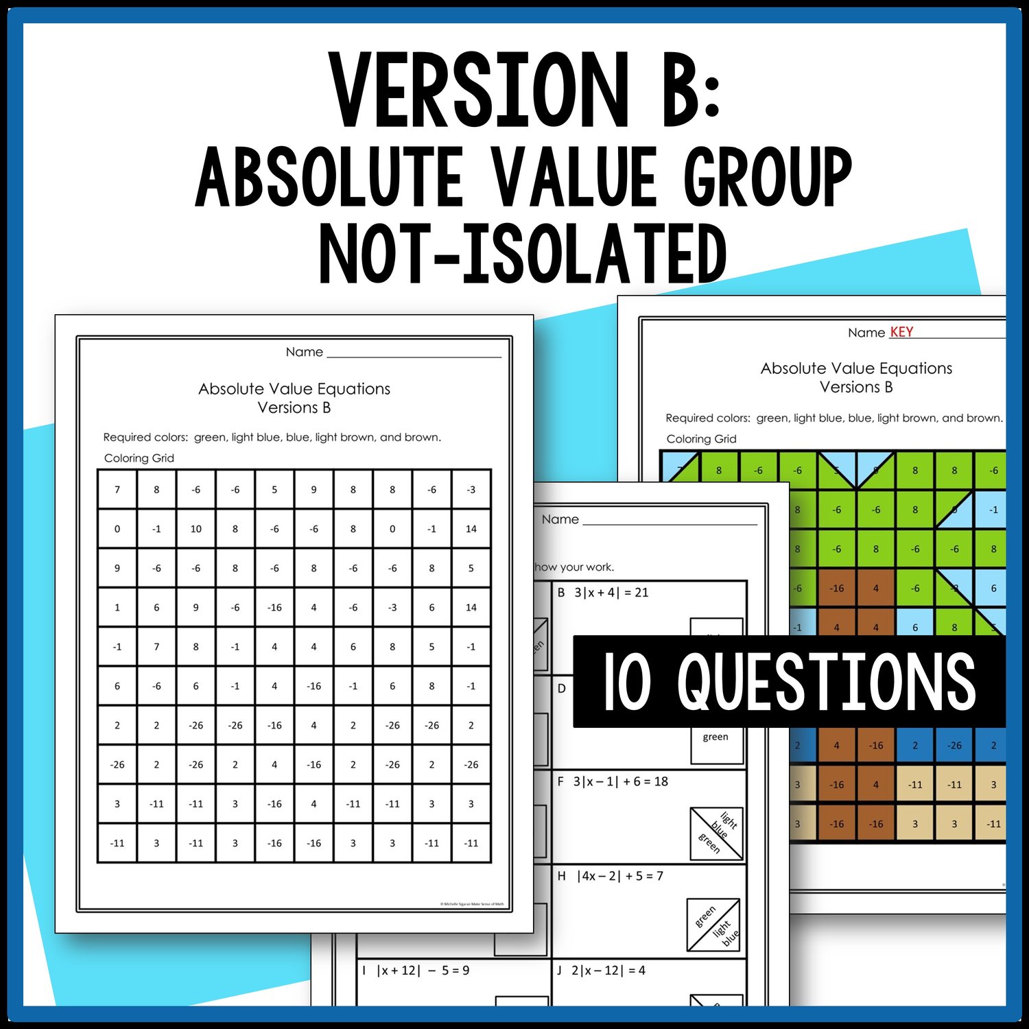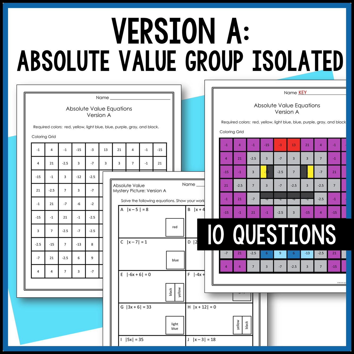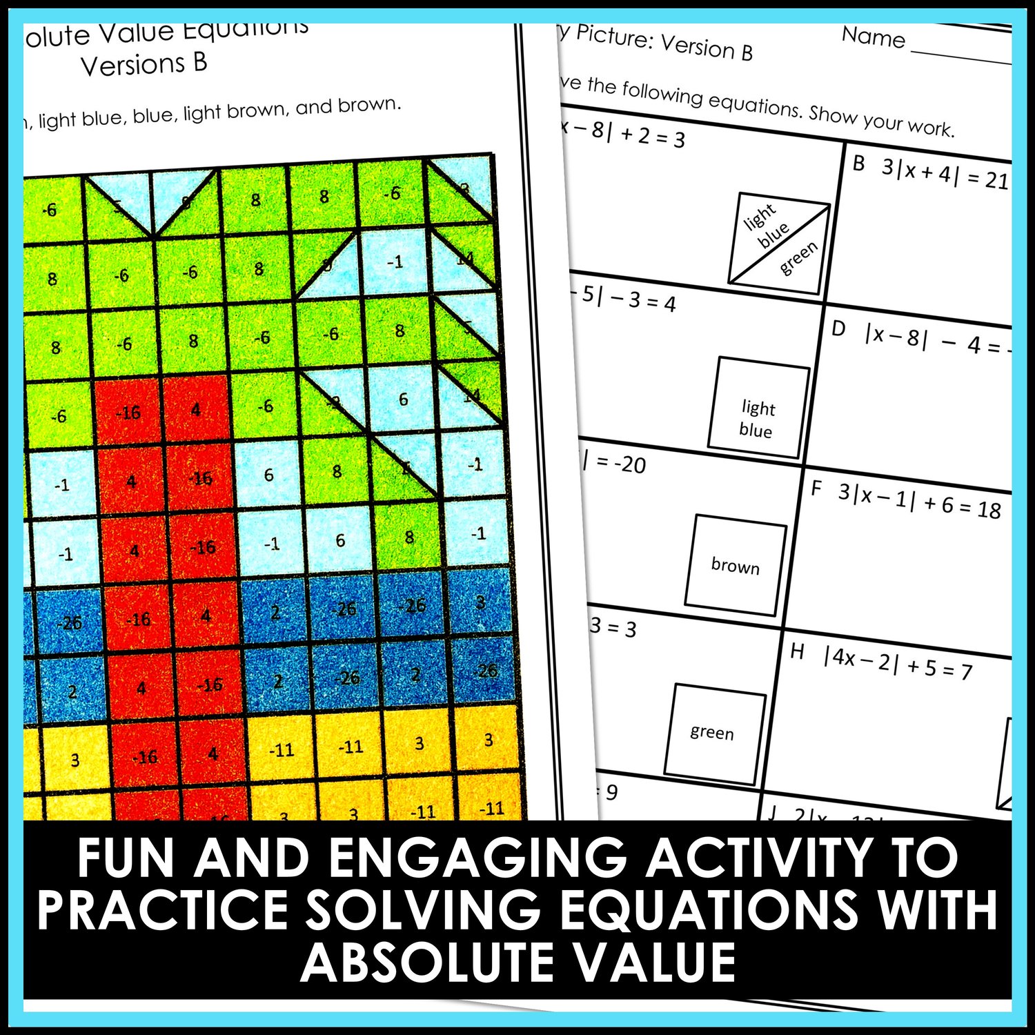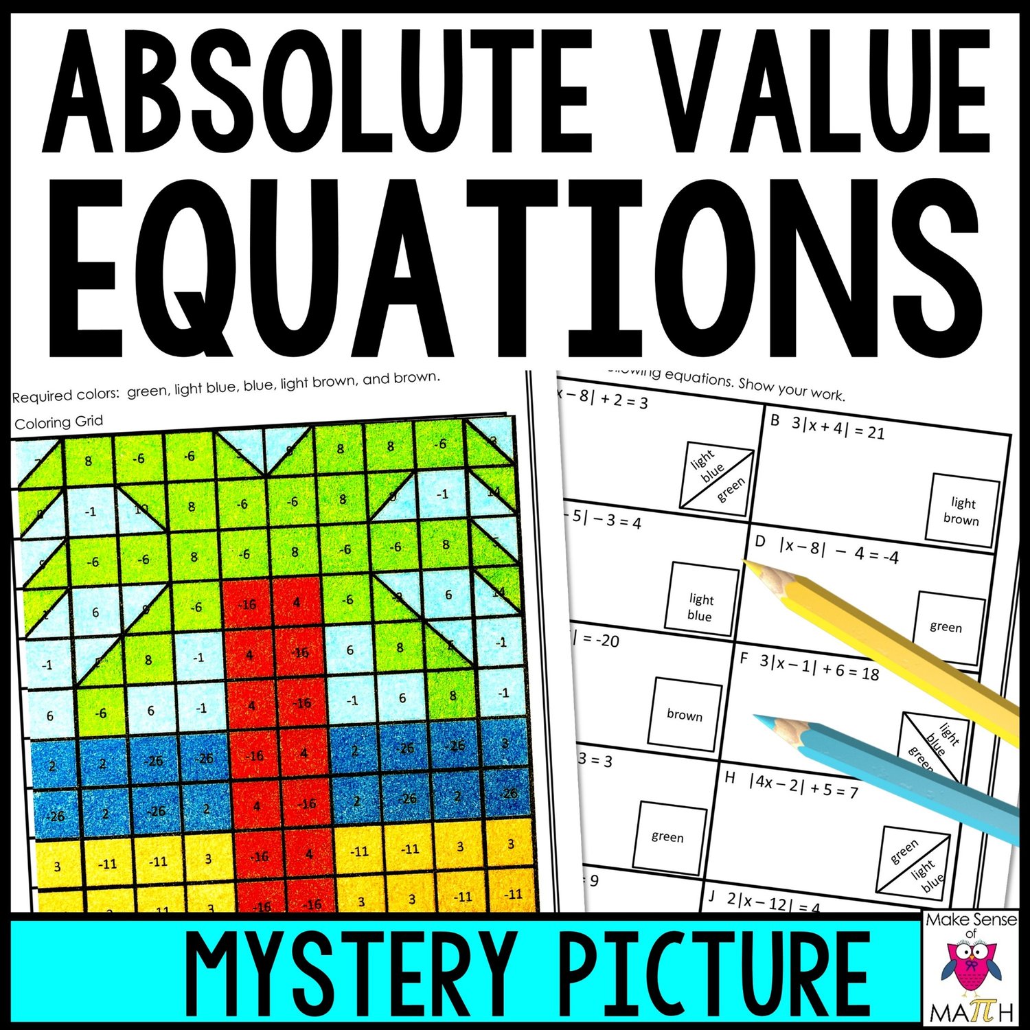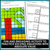 Have your math students engaged while practicing solving absolute value equations. Students will love these mystery pictures activities as they solve absolute value equations. Students will color a grid according to their answer and reveal a mystery picture.