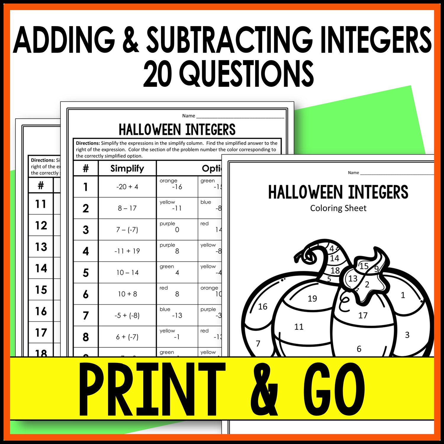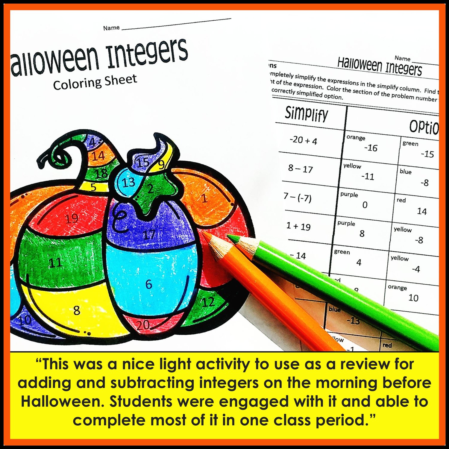 Engage your middle school math with this fun Halloween math activity. Your students will practice adding and subtracting integers while coloring a Halloween-themed worksheet. Also includes an extension to help your students dive deeper into integer operations.