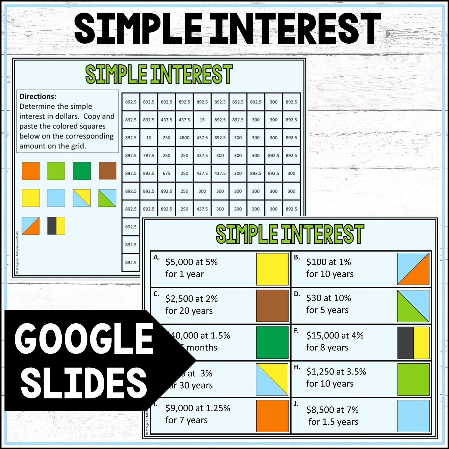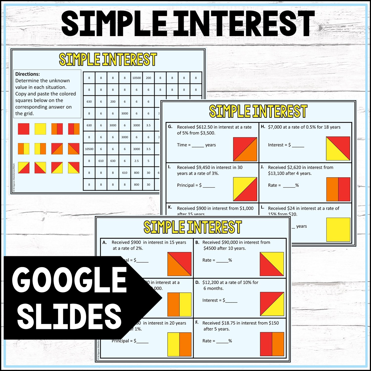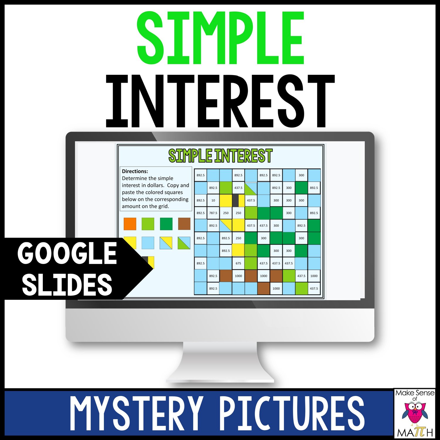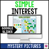 Looking for an engaging activity to practice calculating simple interest? Students will enjoy these mystery pictures on Google Slides as they work through problems involving interest, principal, rate, and time. They will copy and paste colors onto their grid based on their answers to uncover a hidden image.