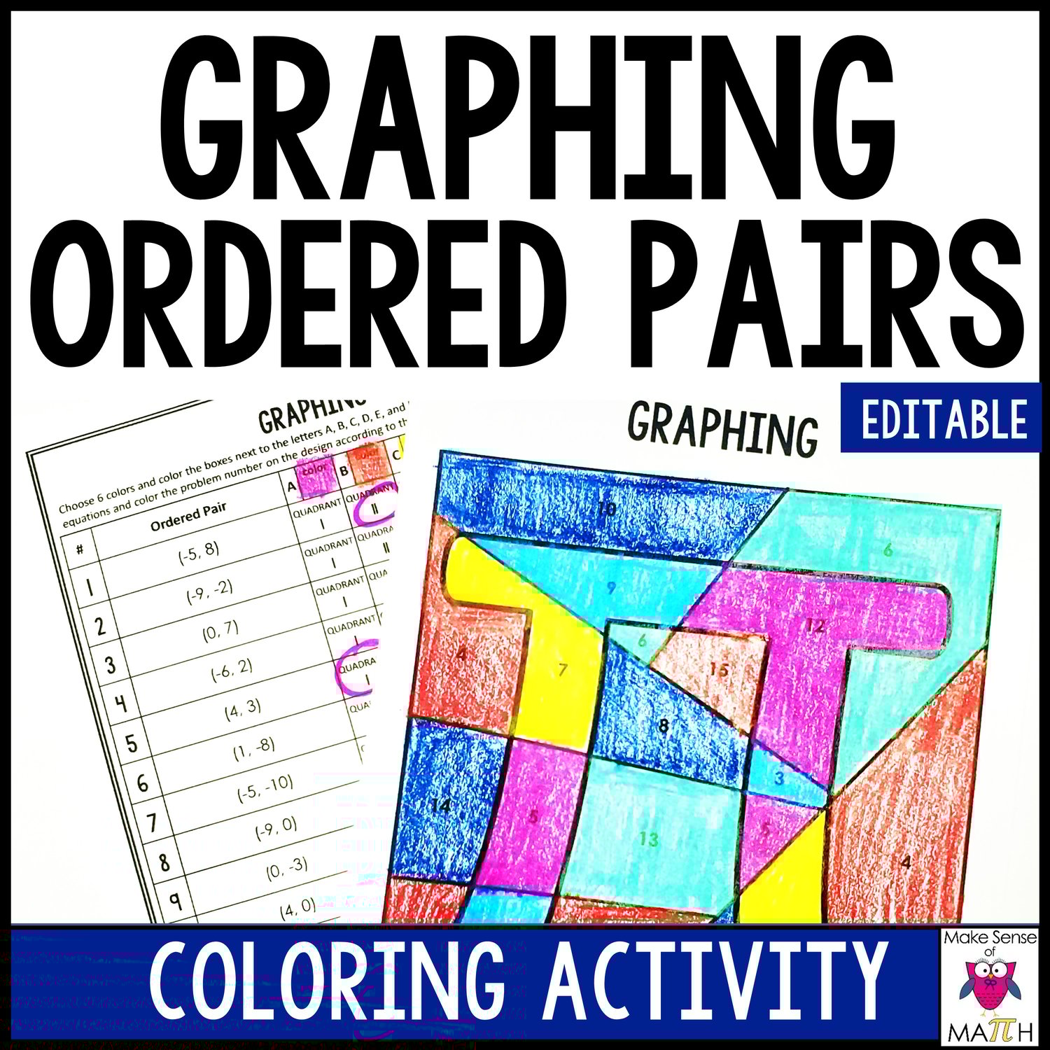 Practice coordinate graphing in the four-quadrant Cartesian plane in the fun activity worksheet. Increase the fluency with graphing coordinates with your 6th grade math students. After answering the graphing coordinate questions the students color a fun design according to their answers. Perfect for your middle school math students. Also includes editable Power Point file.
