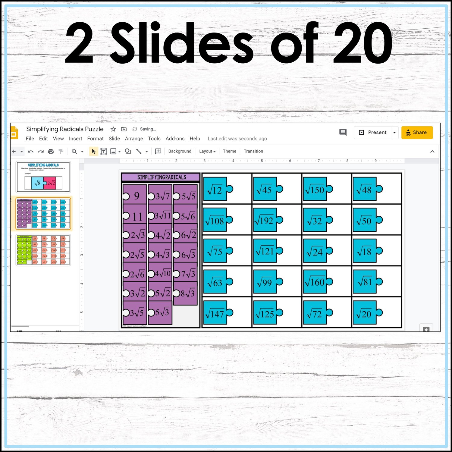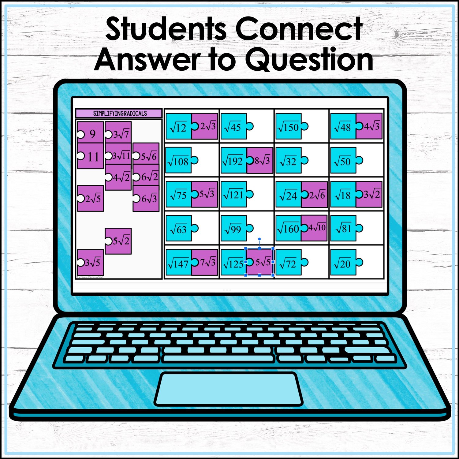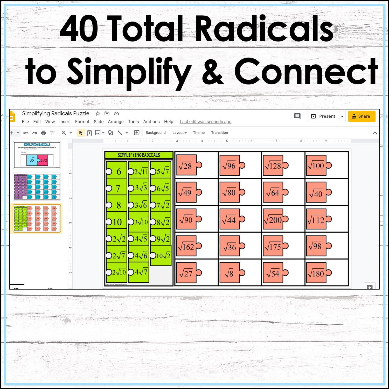 Enjoy a fun activity for practicing simplifying square roots! This interactive Google Slides activity lets students move and match equivalent radicals, making it perfect for both distance learning and in-class practice.