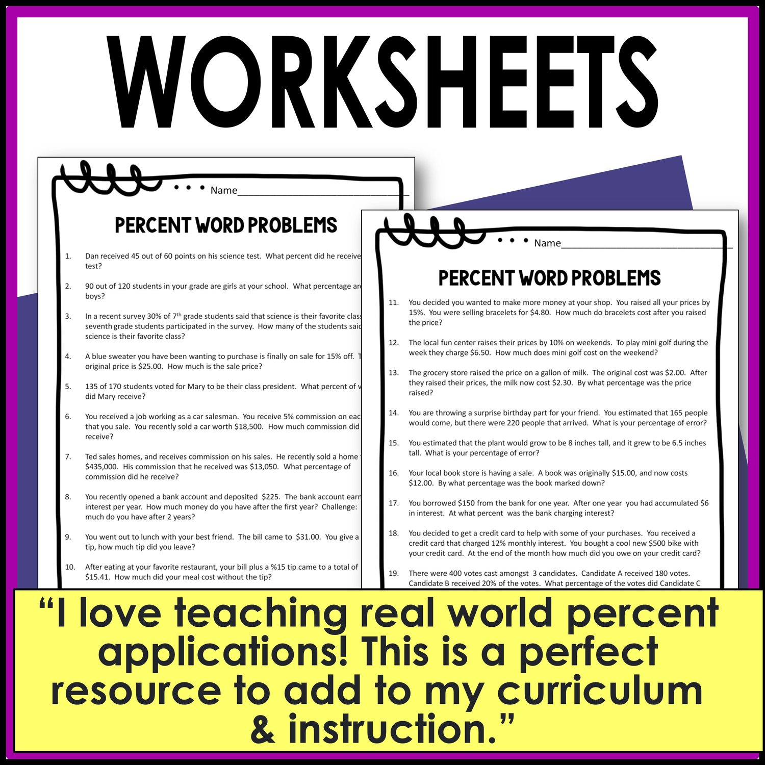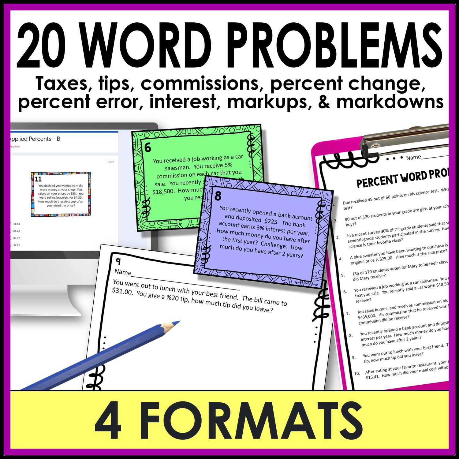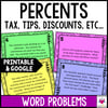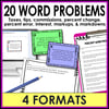 Capture your middle school math students' attention with these comprehensive percent word problems focused on taxes, tips, commissions, percent change, percent error, interest, markups, and markdowns. These problems are crafted to encourage critical thinking about percentages.