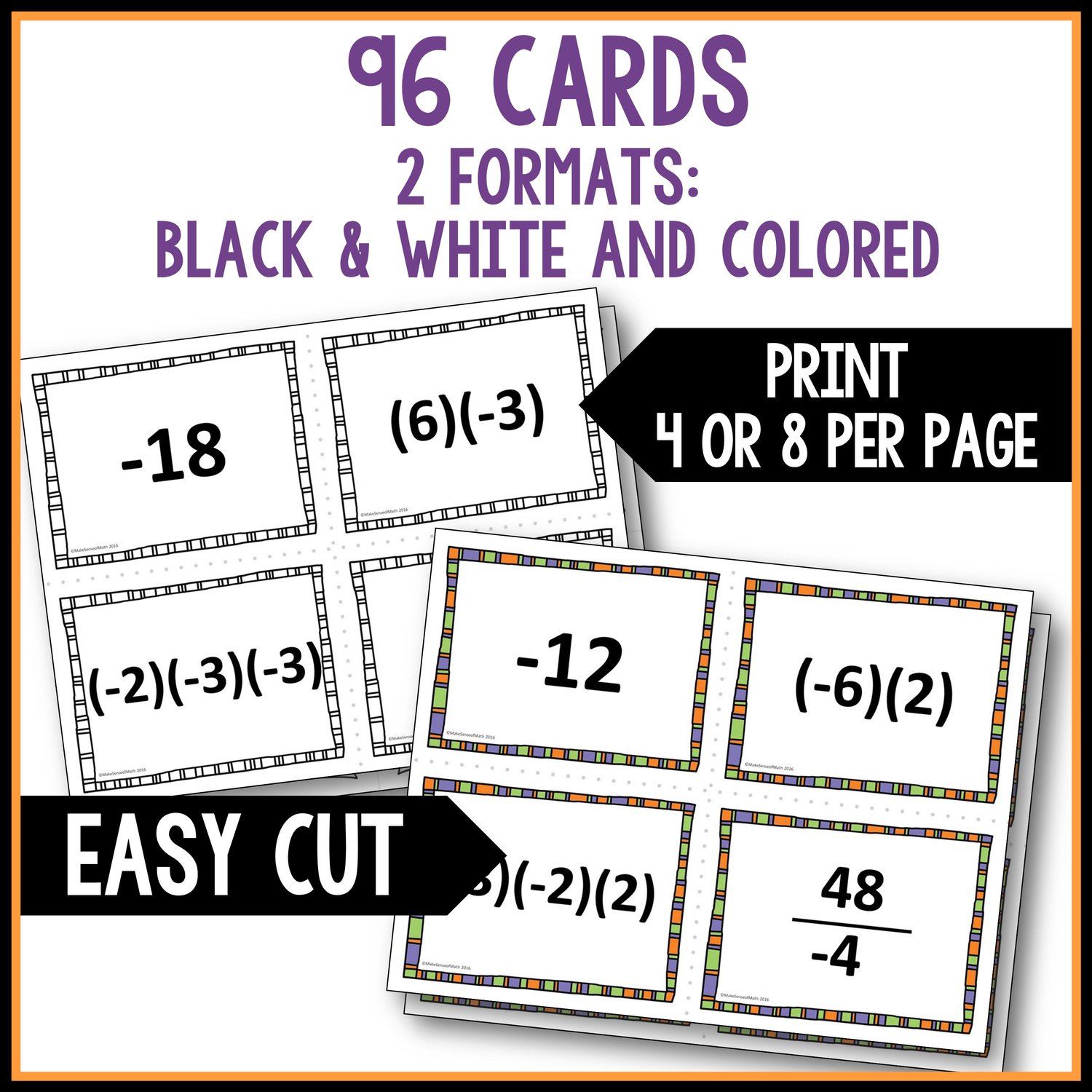 48 sets of 4 (One integer card, one multiplication operation with two integers, one multiplication operation with three integers, and one division operation written as a fraction with the negative sign in various places.)