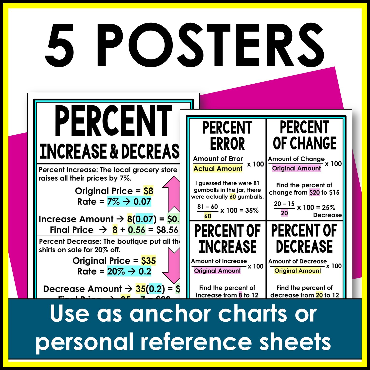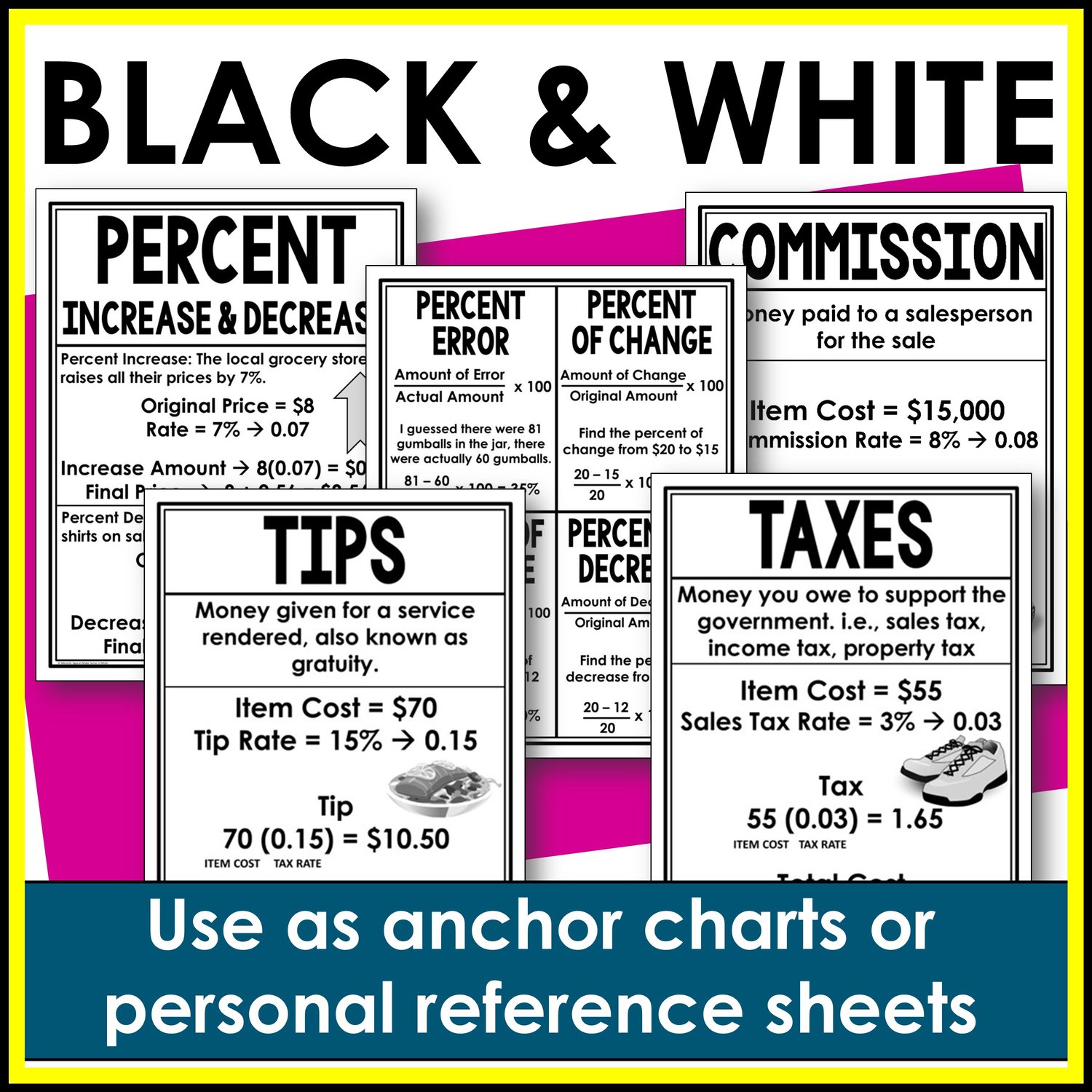 Do you teach about percents with taxes, tips, commissions and more? Check out these anchor charts and personal reference sheets that are perfect to teach percents in the real-world, percent increase and decrease, percent of change, percent error, percent of increase, and percent of decrease. Perfect for your middle school math students to reference when studying applied percents.