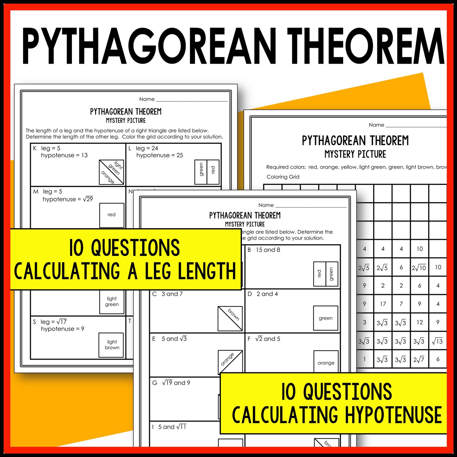 - 20 Total Questions –10 questions calculating the hypotenuse given the length of the legs. 10 questions calculating a leg given the length of the hypotenuse and one leg.